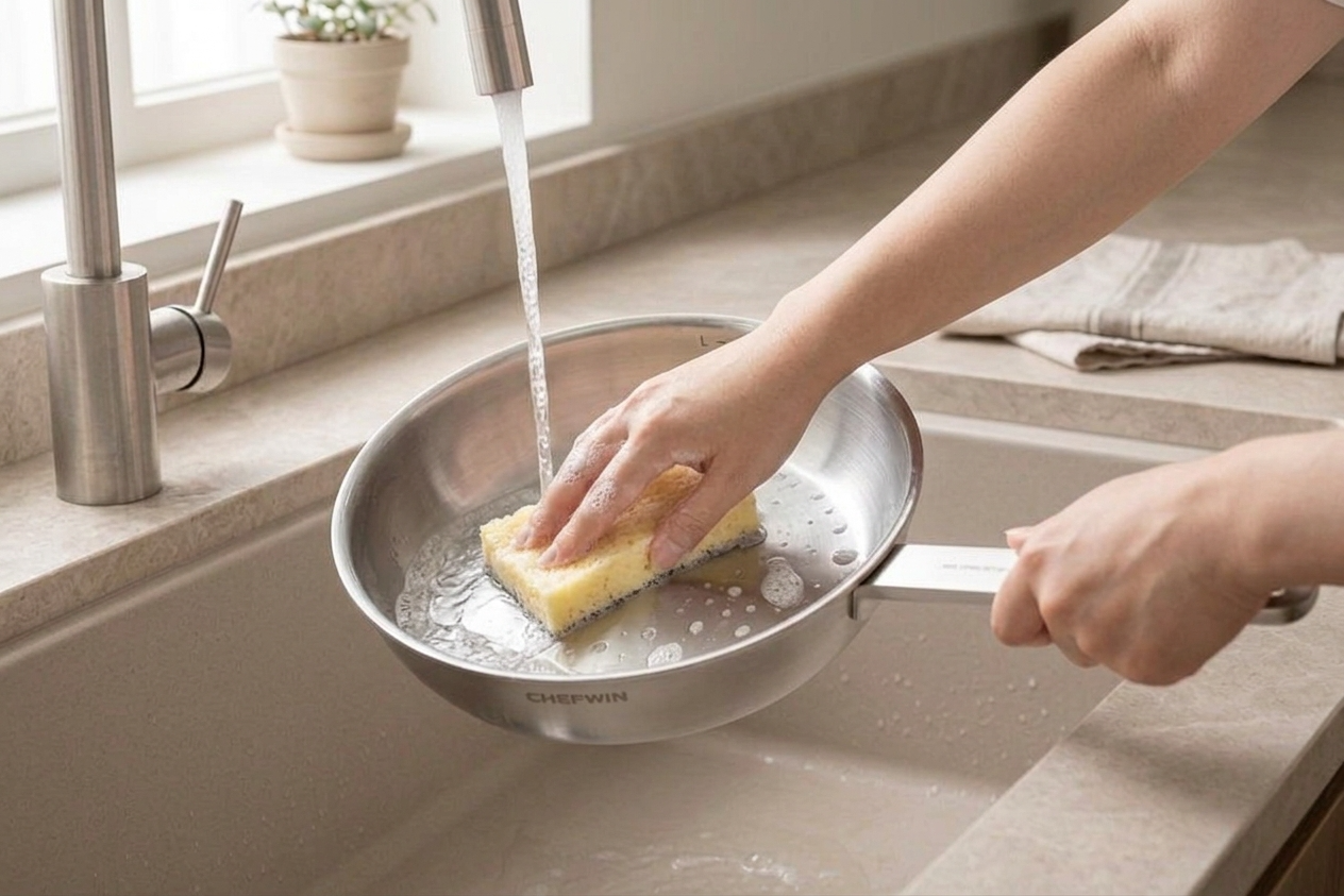 The "Golden Hour" starts right after dinner, while the pan is still warm. Never plunge a hot pan into cold water. Thermal shock can warp even the toughest steel.
