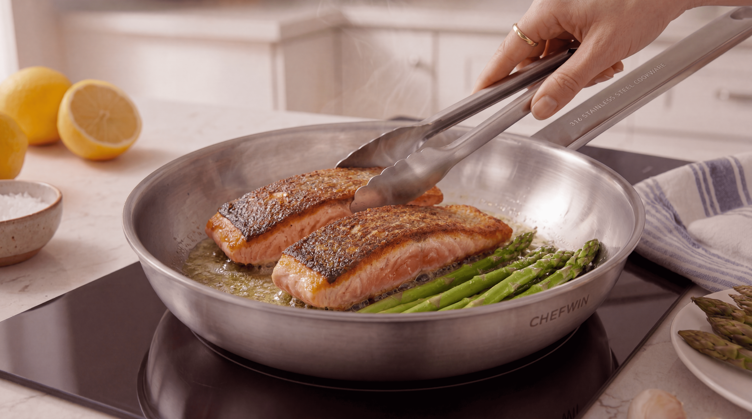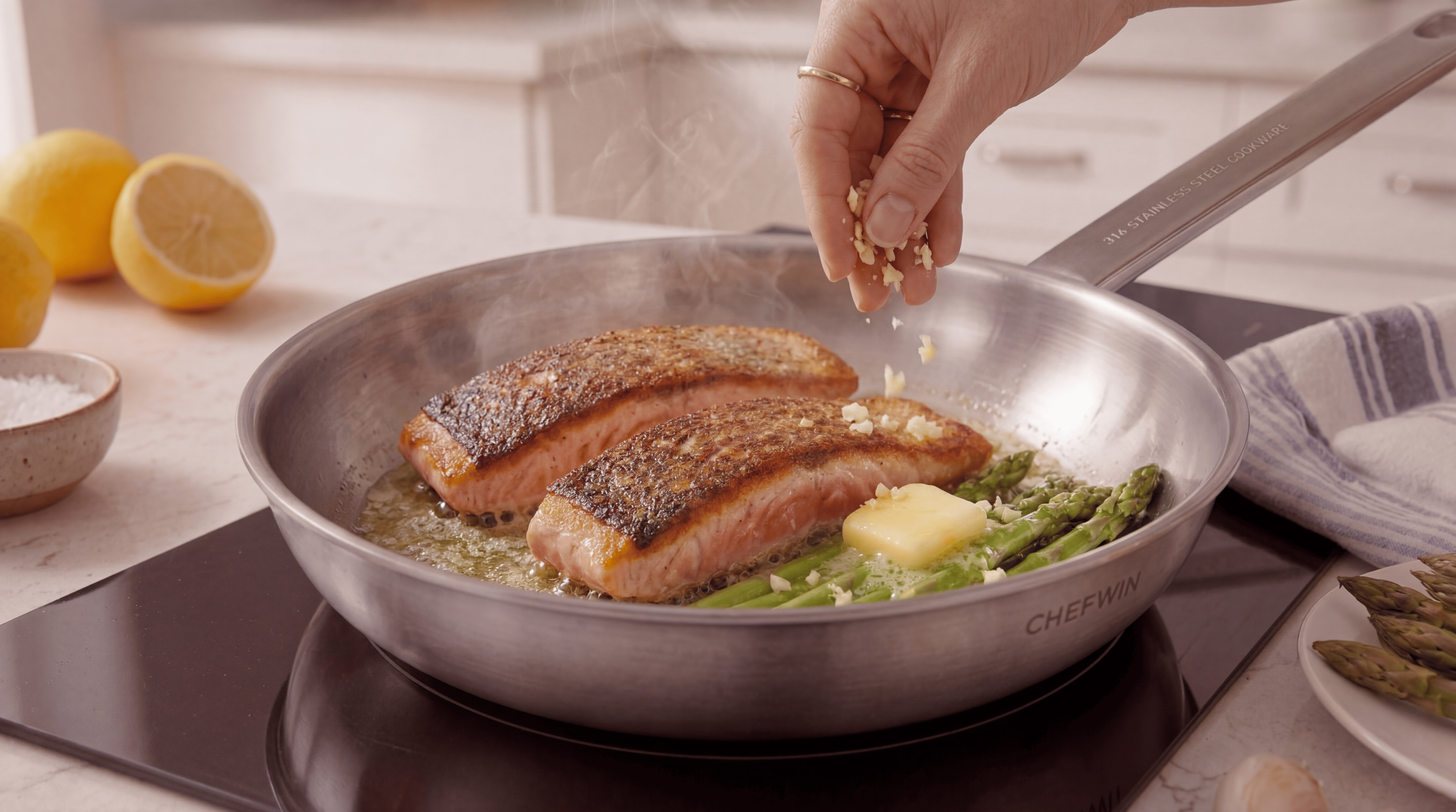 Carefully flip the salmon over. Push the salmon to one side of the pan and add the prepared asparagus to the empty space.