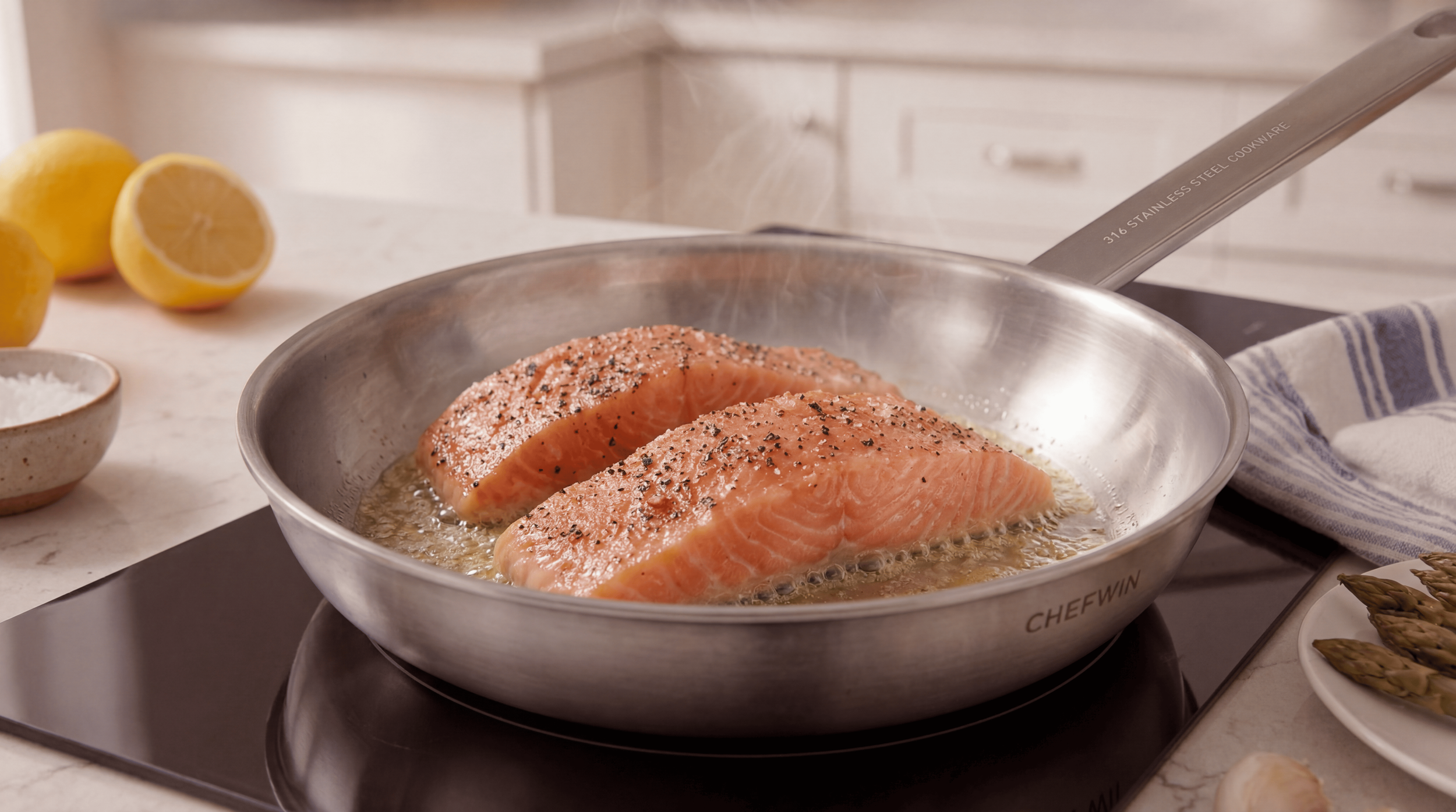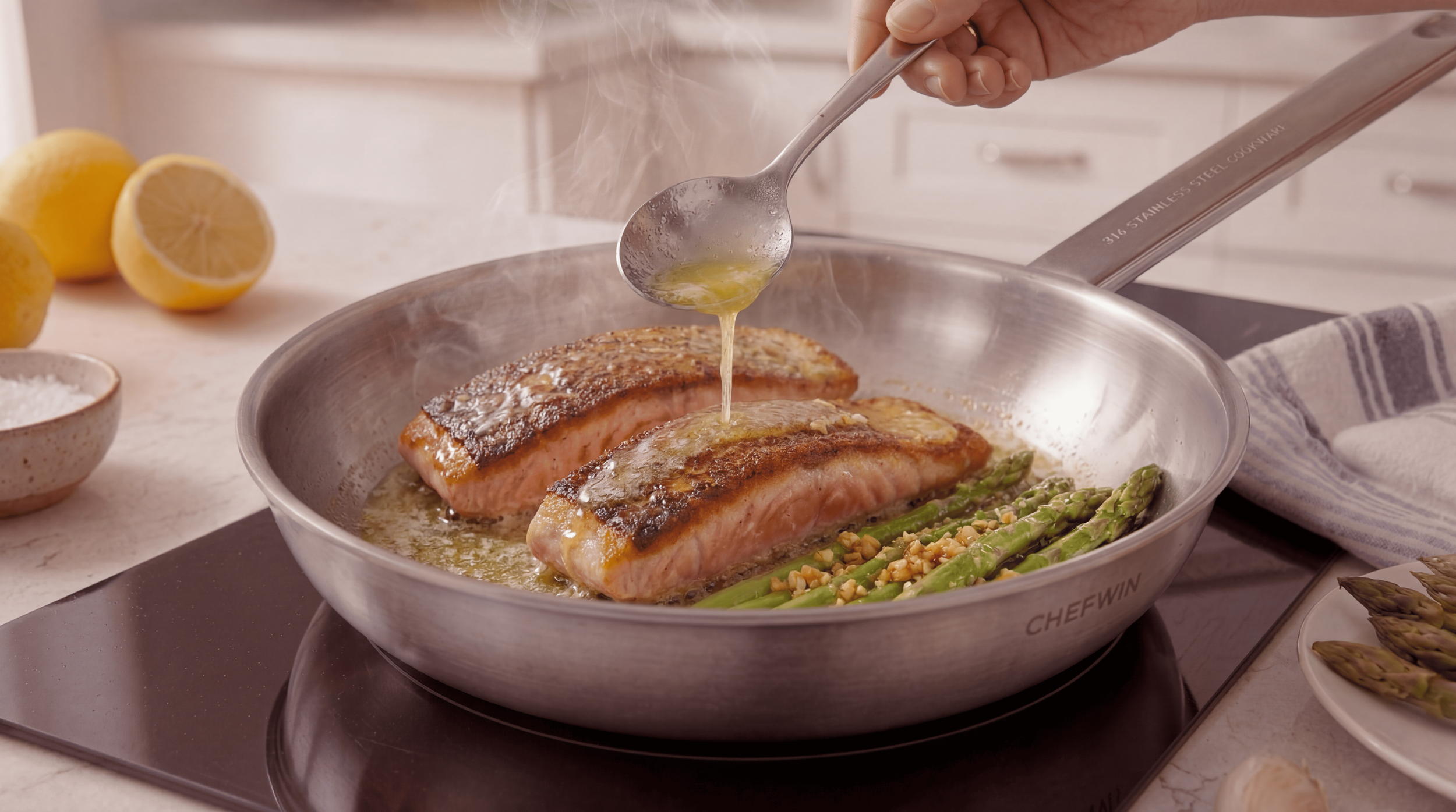 As the butter melts and infuses with the garlic, tilt the pan slightly. Use a spoon to repeatedly scoop up the garlic butter and pour it over the salmon fillets for 2-3 minutes. This adds flavor and moisture.
