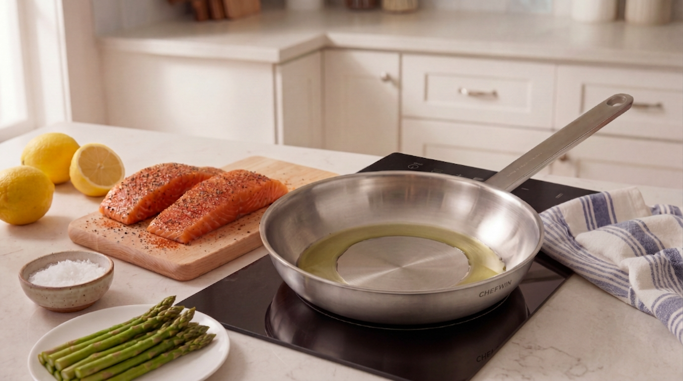 While prepping the asparagus by trimming the woody ends and lightly coating them with olive oil, preheat your pan with olive oil over medium-high heat.