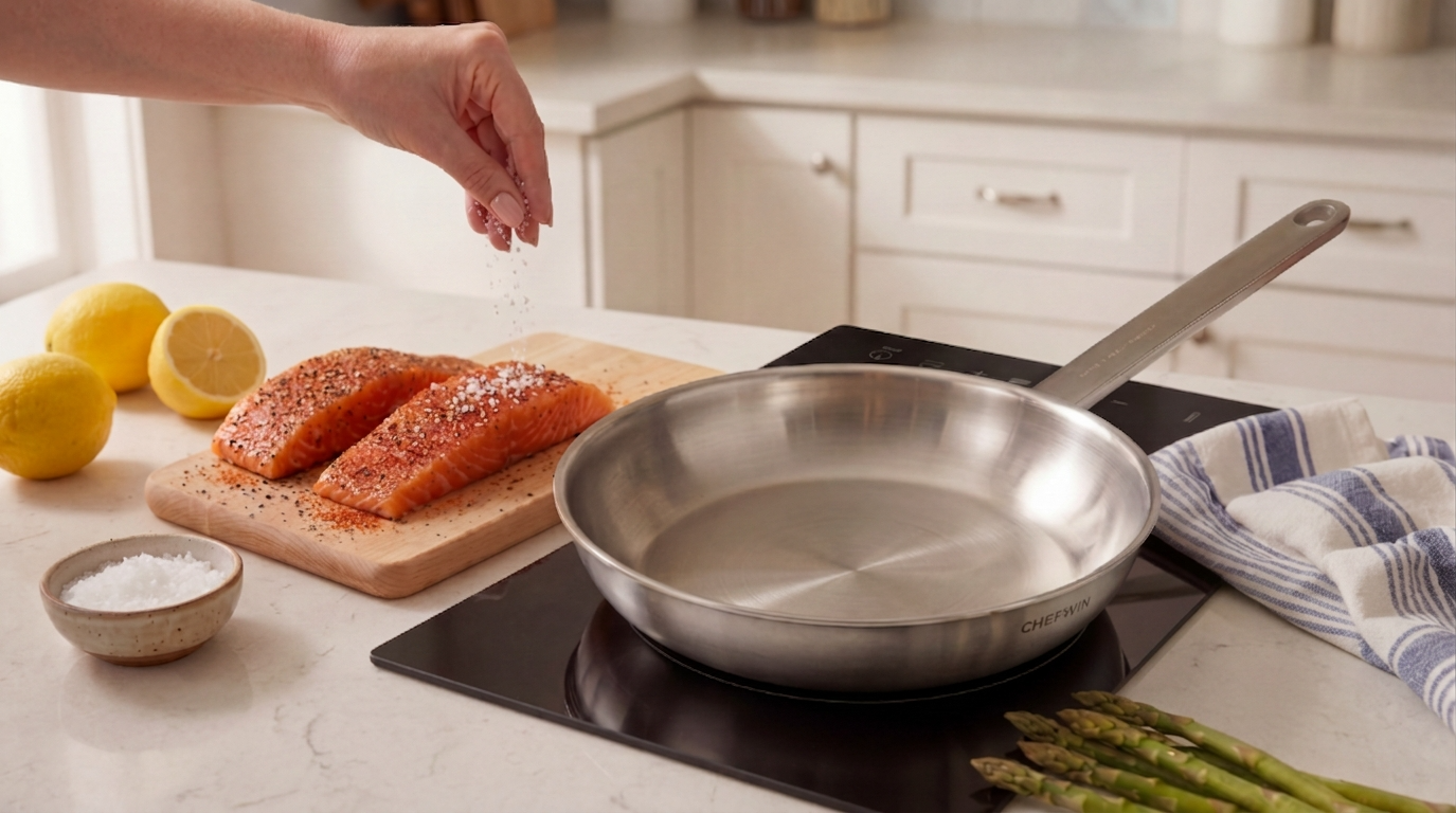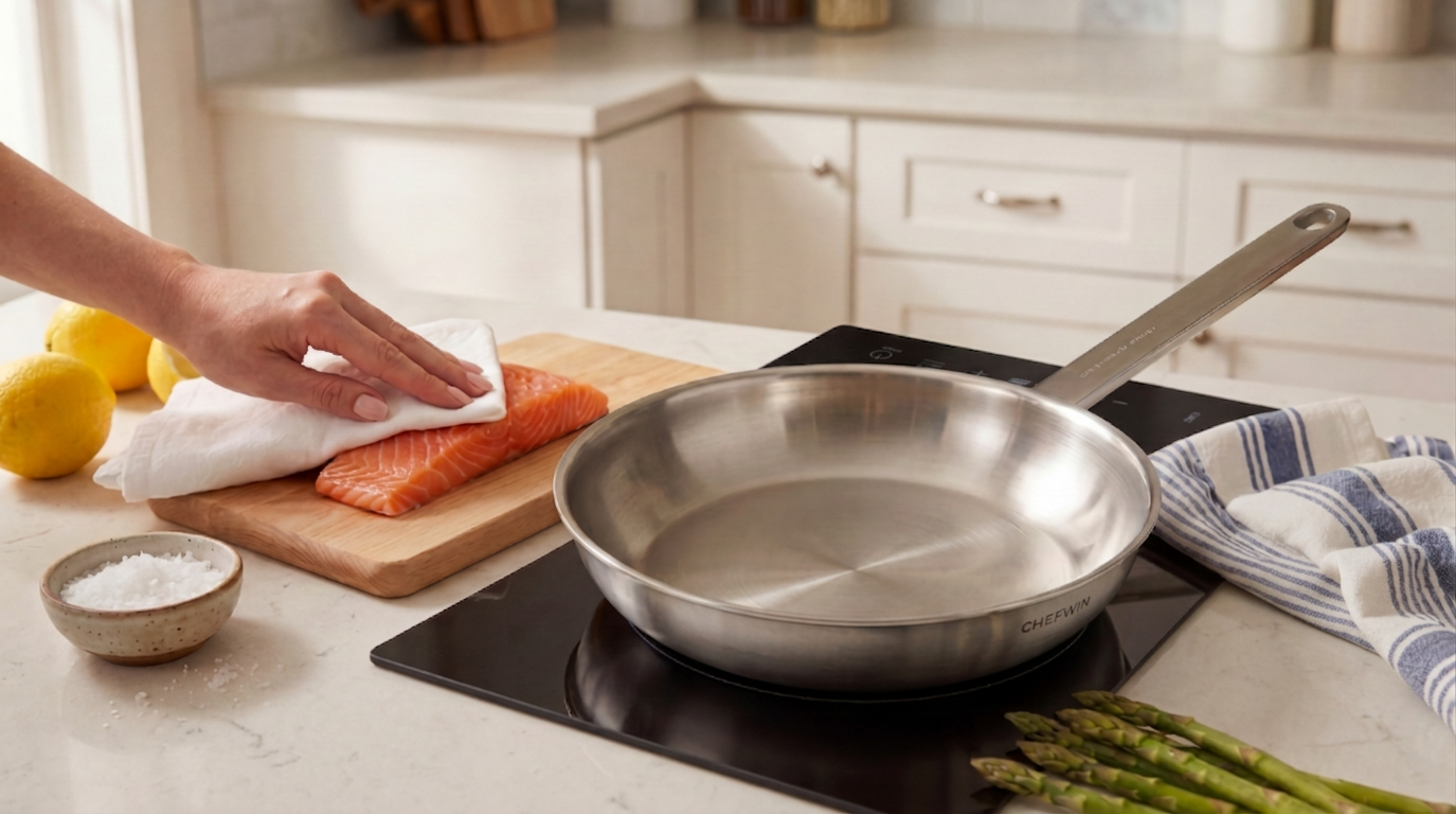 Season both sides of the salmon evenly with salt, pepper, and paprika powder.