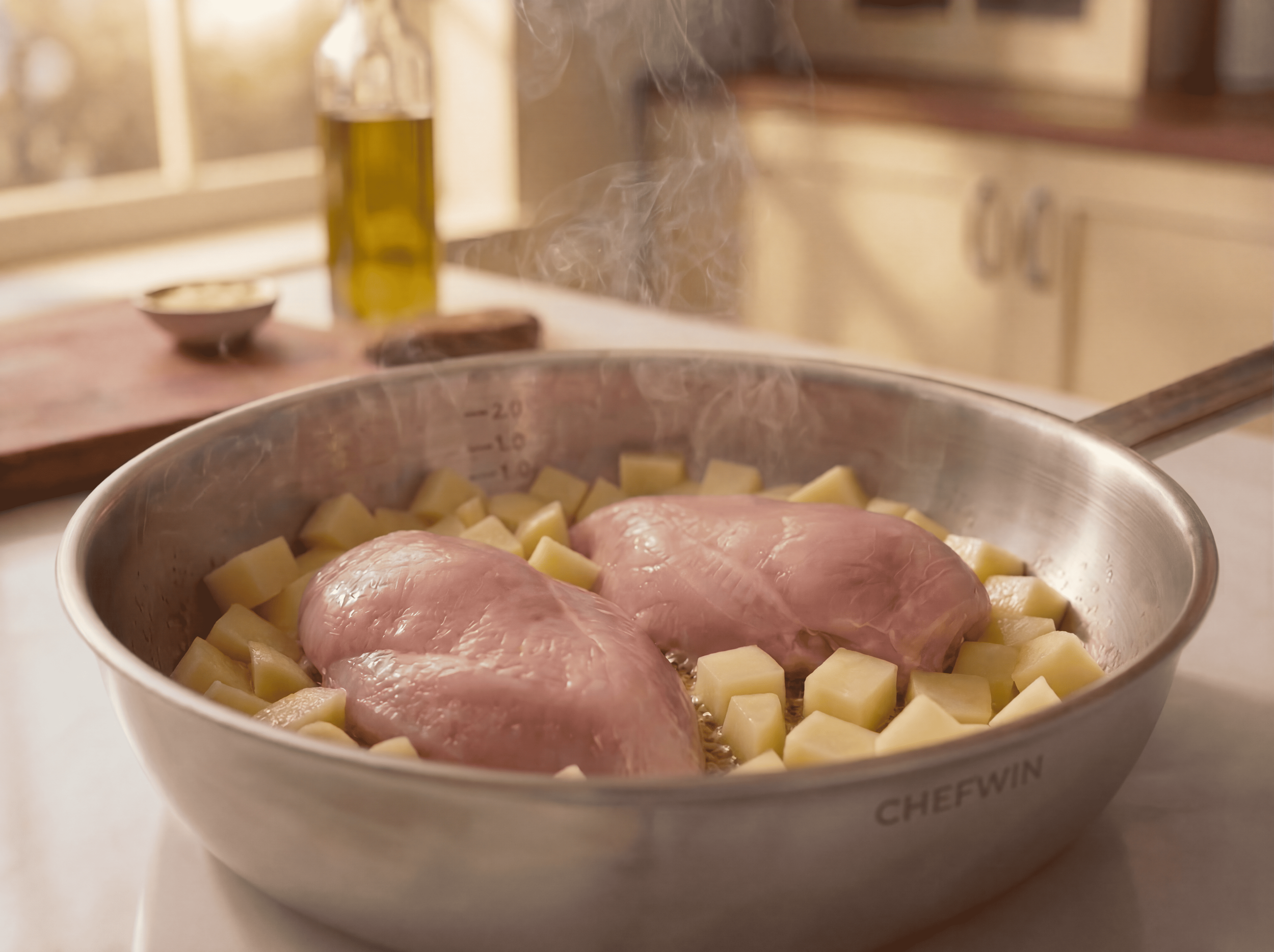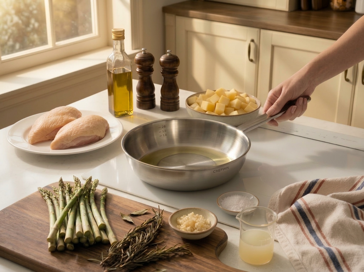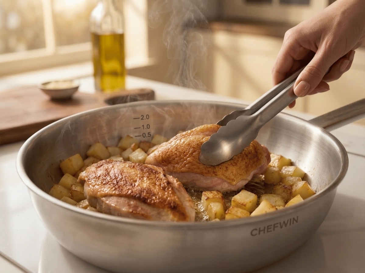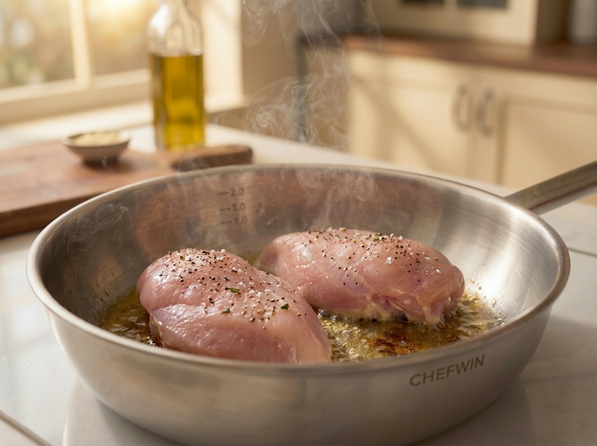 Place the chicken skin-side down. Do not touch it for 5 minutes! The heat from the 5-ply pan will transform the skin into a beautiful golden brown.