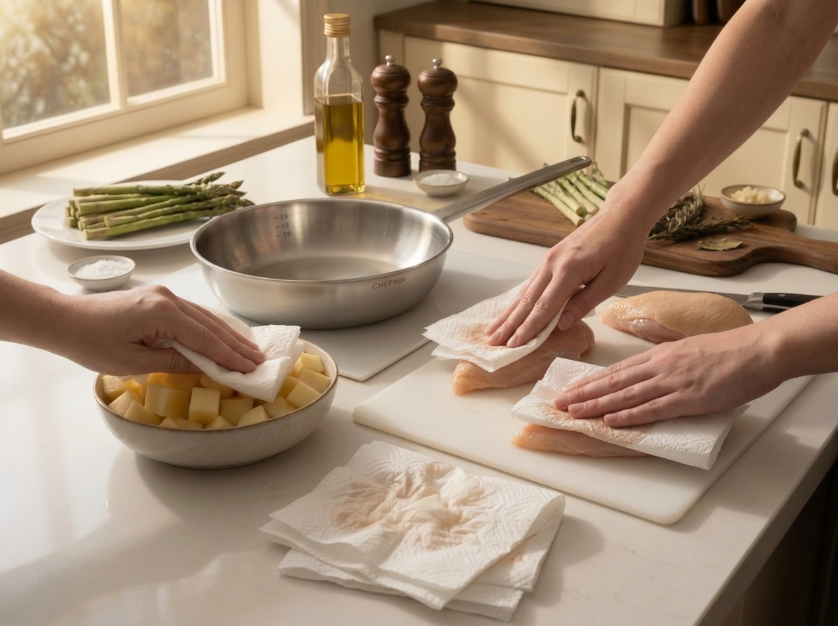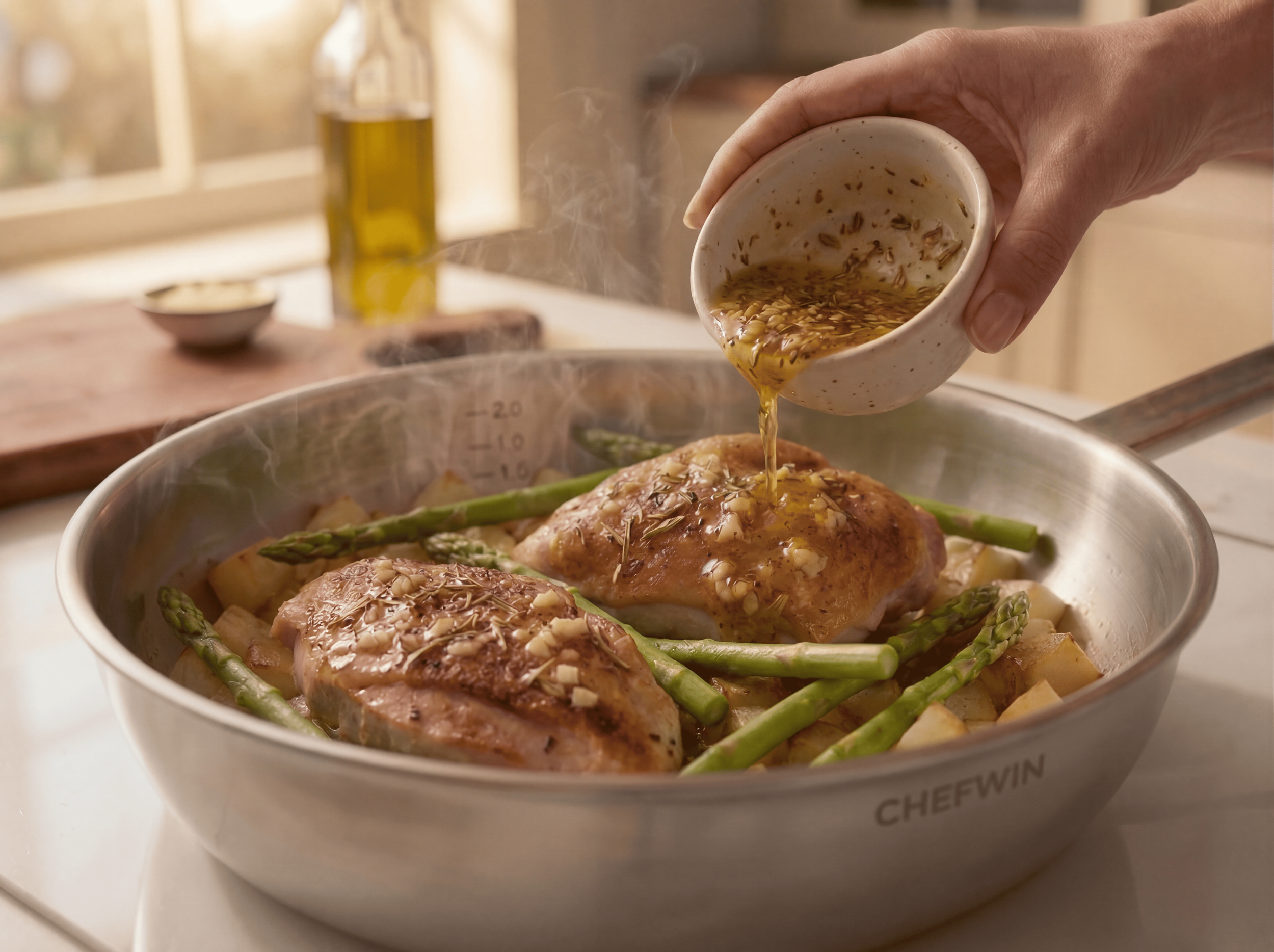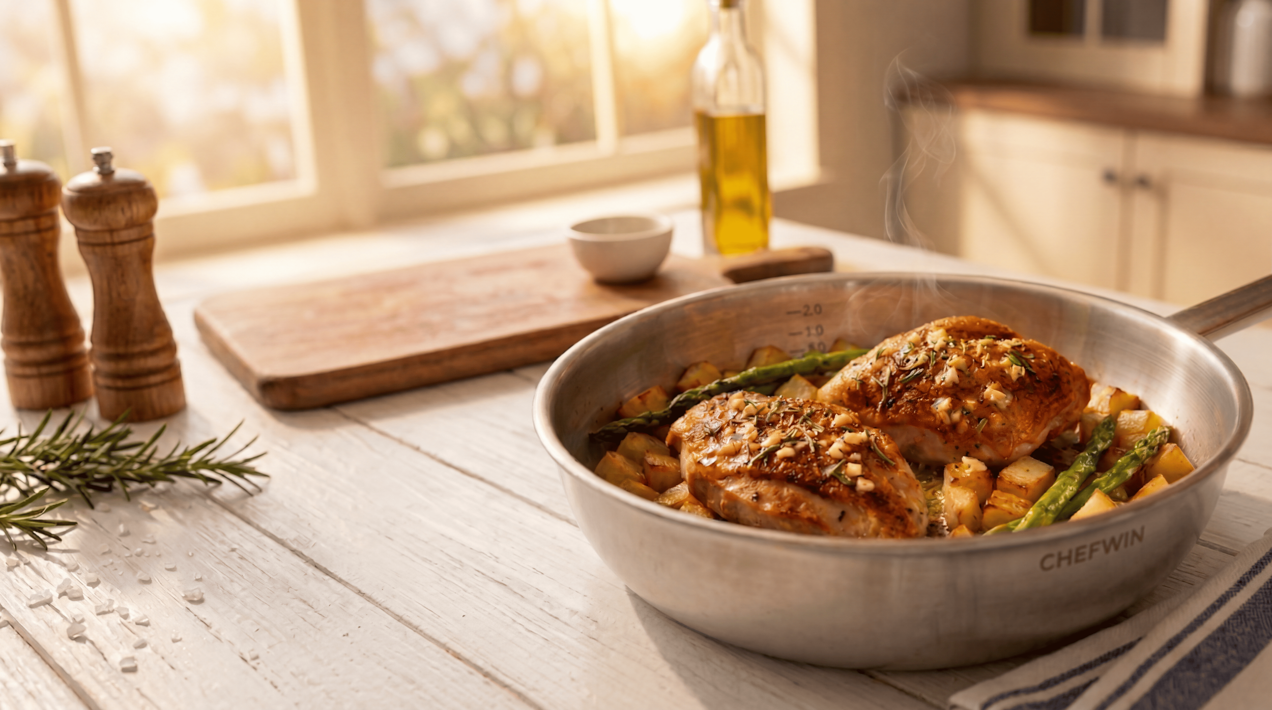 Place the chicken skin-side down. Do not touch it for 5 minutes! The heat from the 5-ply pan will transform the skin into a beautiful golden brown.